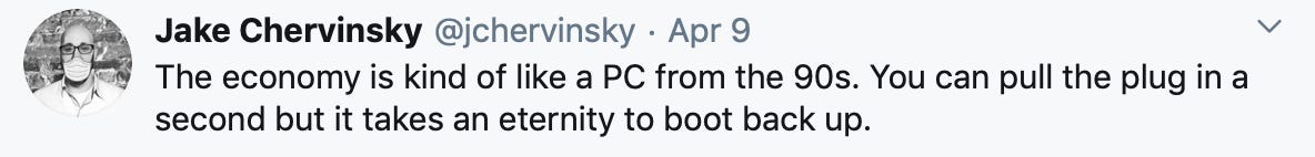 When the economy is shut off it doesn’t exactly turn back on by the flip of a switch: