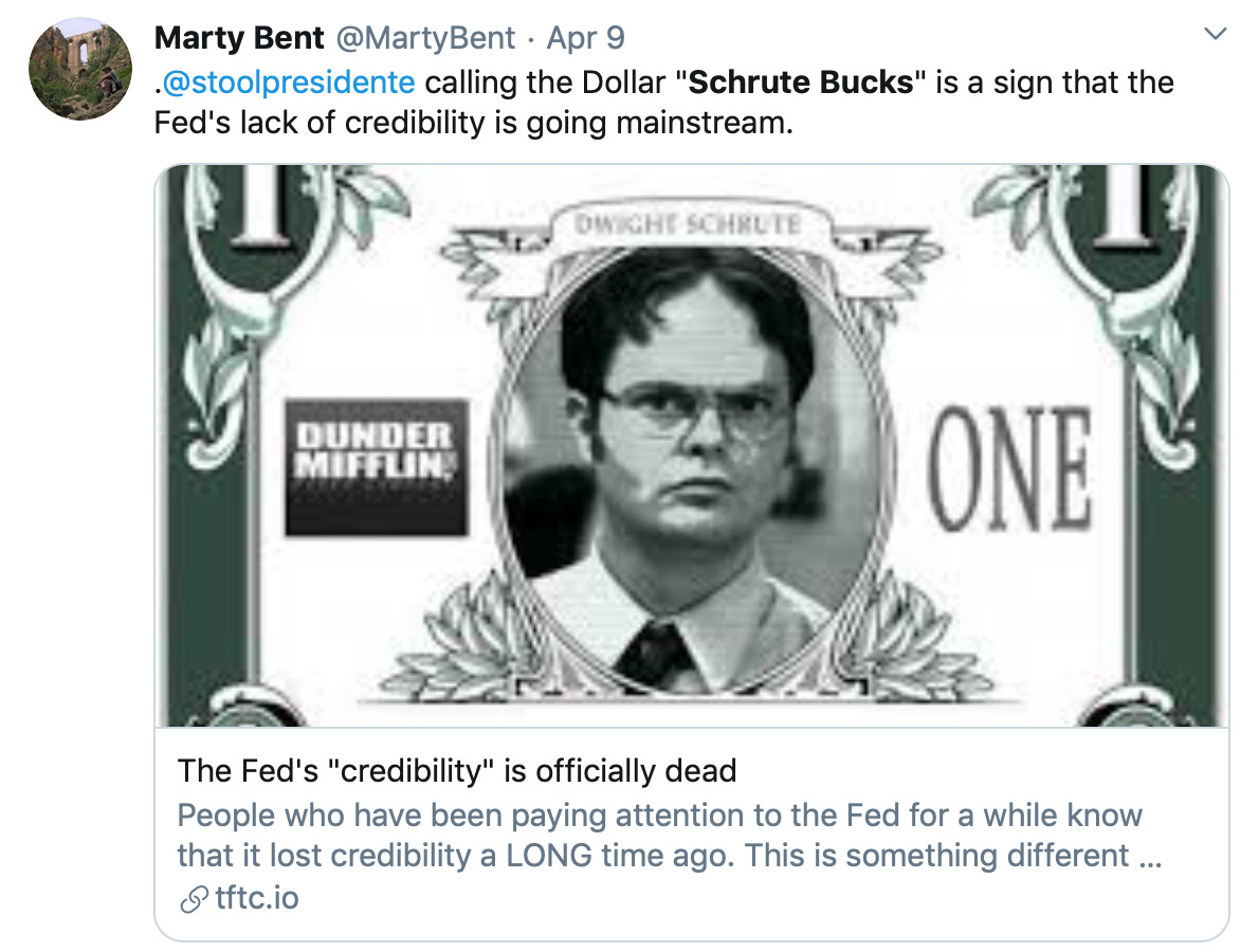 The narrative quickly switched from “will I have enough money?” to “will my money be worth anything?” The Founder of Barstool, Dave Portnoy, made a reference to the popular TV show The Office this week saying, “It’s like Schrute bucks, if every government could just print unlimited Schrute bucks, why wouldn’t they?” Countries like Venezuela and Zimbabwe are perfect examples of what happens when a government prints too much money. Bitcoin is actually so popular in Venezuela that its always trading at a premium since the native Bolivar has been hyper-inflated by the government.
