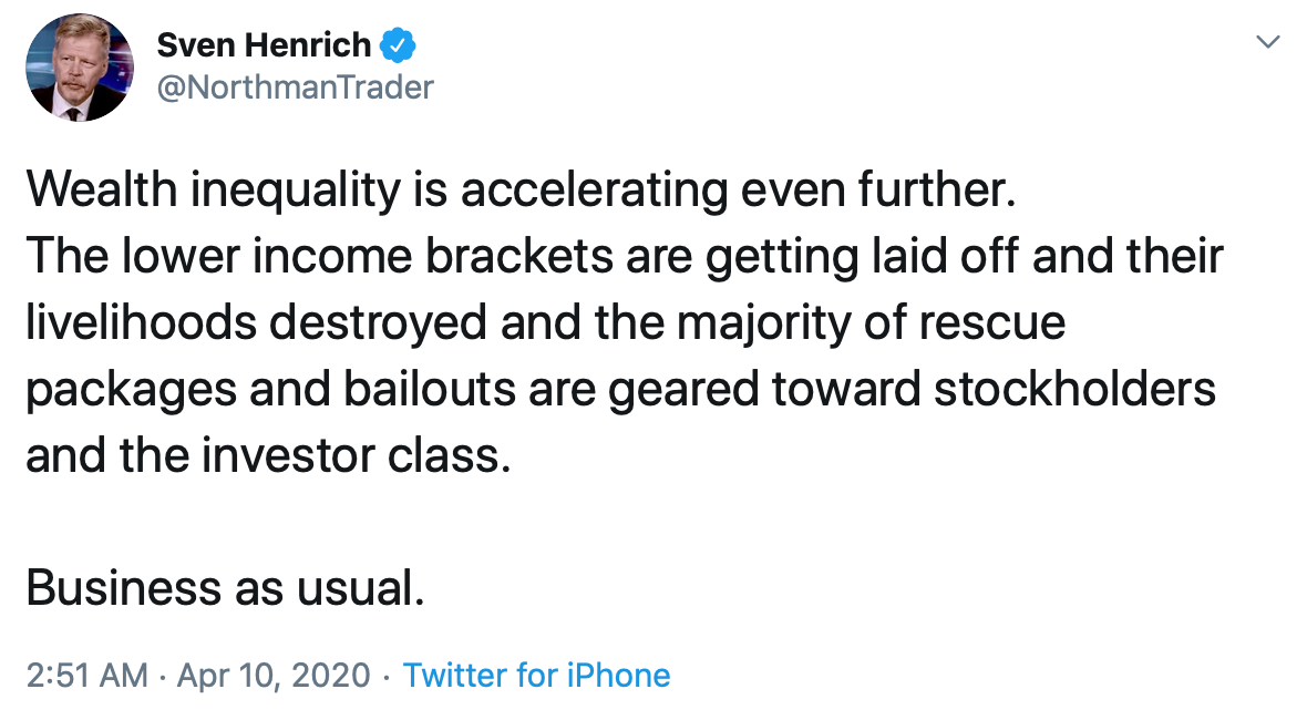 The situation regarding the coronavirus is only becoming more uncertain as governments around the world struggle to prevent the spread of coronavirus while also keeping supply chains intact. Morgan Stanley’s forecast for new coronavirus cases also shows the possibility of a “second wave” which shouldn’t go unheeded. And of course to add insult to injury, the Federal Reserve has been adding trillions of dollars to the budget every week primarily targeting big business while giving workers and small & medium businesses the brunt of it. This is a recipe for disaster.