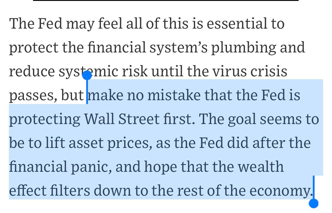 The Federal Reserve primarily targeted Wall Street with their previous stimulus packages leaving Main Street out to dry. Liquidity was being provided to large hedge funds and banks while the majority of small and medium businesses couldn't get the required funding to stay afloat. Here is an excerpt from the Wall Street Journal supporting Sven Henrich’s description of the Federal Reserve’s original plan to save the the top 1% and hope for trickle down economics later: