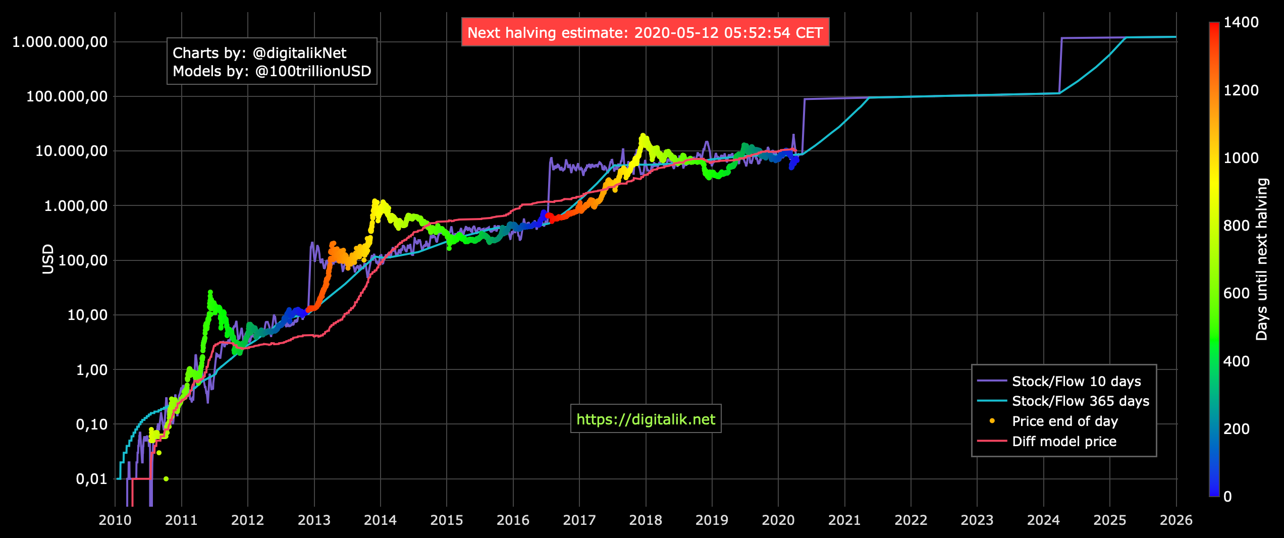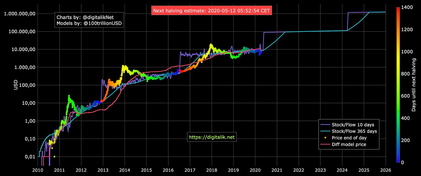 Bitcoin is a disinflationary currency which means the amount of bitcoin that gets put into circulation every 4 years decreases. This is what separates bitcoin from inflationary fiat money. In may, the amount of bitcoin that is added to the circulating supply will be cut from 12.5 to 6.25 bitcoin. The Bitcoin stock to flow model attempts to map out price in relation to supply following this 4 year halving cycle. Remember all models are wrong but some are useful: