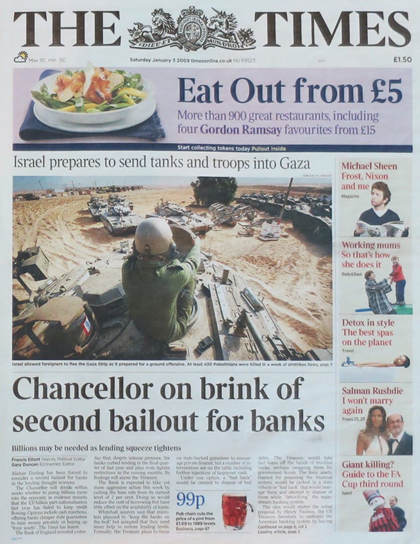 The Genesis block (The first set of transactions verified by the Bitcoin blockchain) reads “chancellor on the brink of second bailout” which is the headline from the New York Times article signaling the Federal Reserve’s bailout package for the banks.