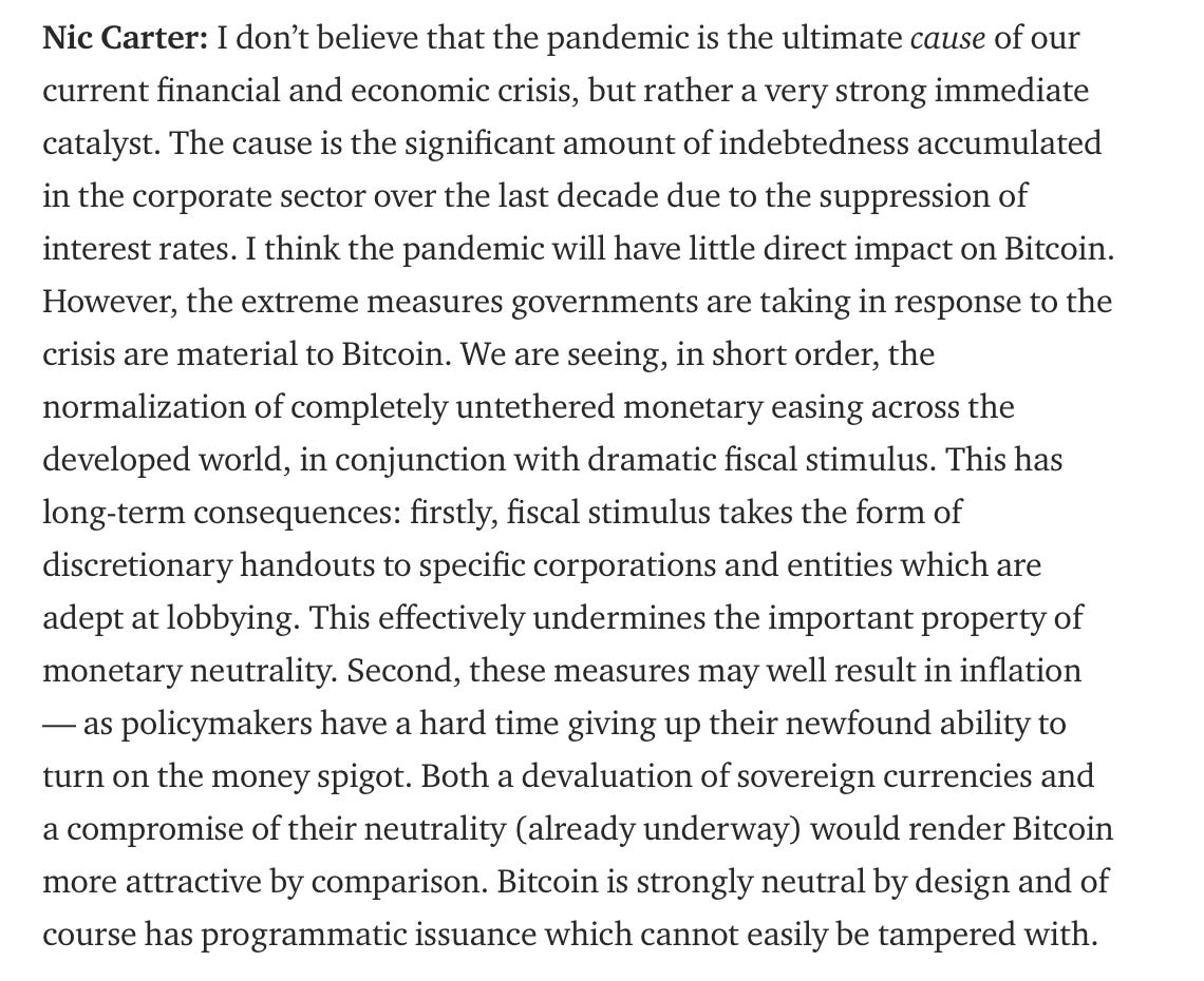 Conclusion: Bitcoin doesn’t care about the pandemic and it doesn’t care about if people see it as a store of value or not. As Nic Carter said, "I think the pandemic will have little direct impact on Bitcoin. However, the extreme measures governments are taking in response to the crisis are material to Bitcoin.” Bitcoin has already begun to climb back to its price before the crash. The reason I suggest both bitcoin and gold as opposed to just bitcoin is because gold has a proven track record during market turmoil while bitcoin has yet to prove itself during a financial crisis. There are economic consequences to what the Fed is doing and having exposure to both will help you weather this crisis while keeping you hedged for the future. Even if you aren’t as convicted as I am when it comes to future expected inflation I still believe adding bitcoin (and gold) to your portfolio will at least reduce overall portfolio risk while increasing your risk to reward ratio.